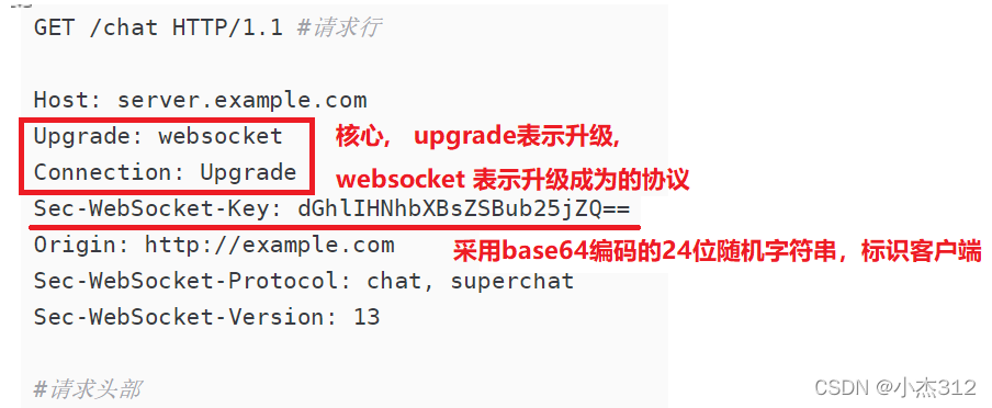 GET /chat HTTP/1.1 #请求行 Host: server.example.com Upgrade: websocket Connection: Upgrade Sec-WebSocket-Key: dGhlIHNhbXBsZSBub25jZQ== Origin: http://example.com Sec-WebSocket-Protocol: chat, superchat Sec-WebSocket-Version: 13 #请求头部