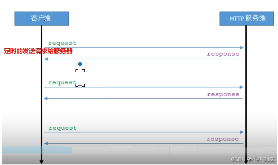 - 定时轮询, 不断地定时地询问服务器, 你需要发送消息吗, 不断地请求, 定时发出询问, 如果服务器需要发送数据到客户端, 询问来了就可以发送状态变更,数据到客户端了