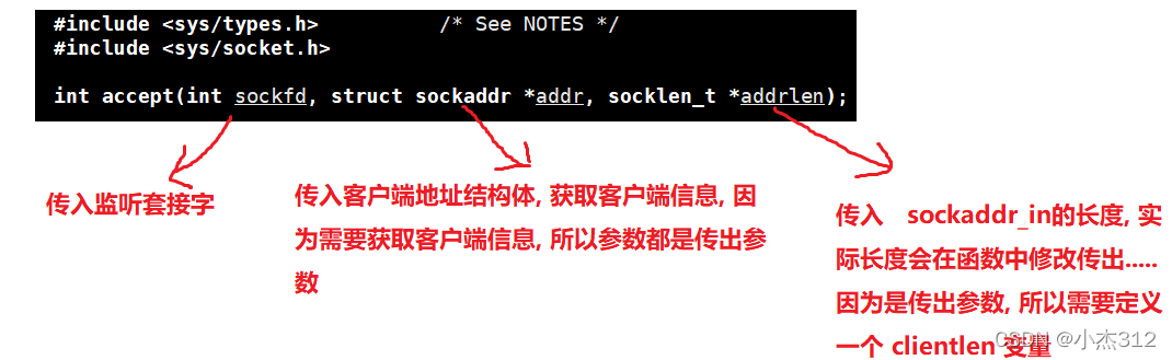 return val : 返回值 正是上述的 connfd, 连接套接字, 每实现一个连接 都会返回一个新的connfd, 所以一般accept函数都是放在一个死循环中不停的接收客户端的连接亲求,并且对齐进行服务....