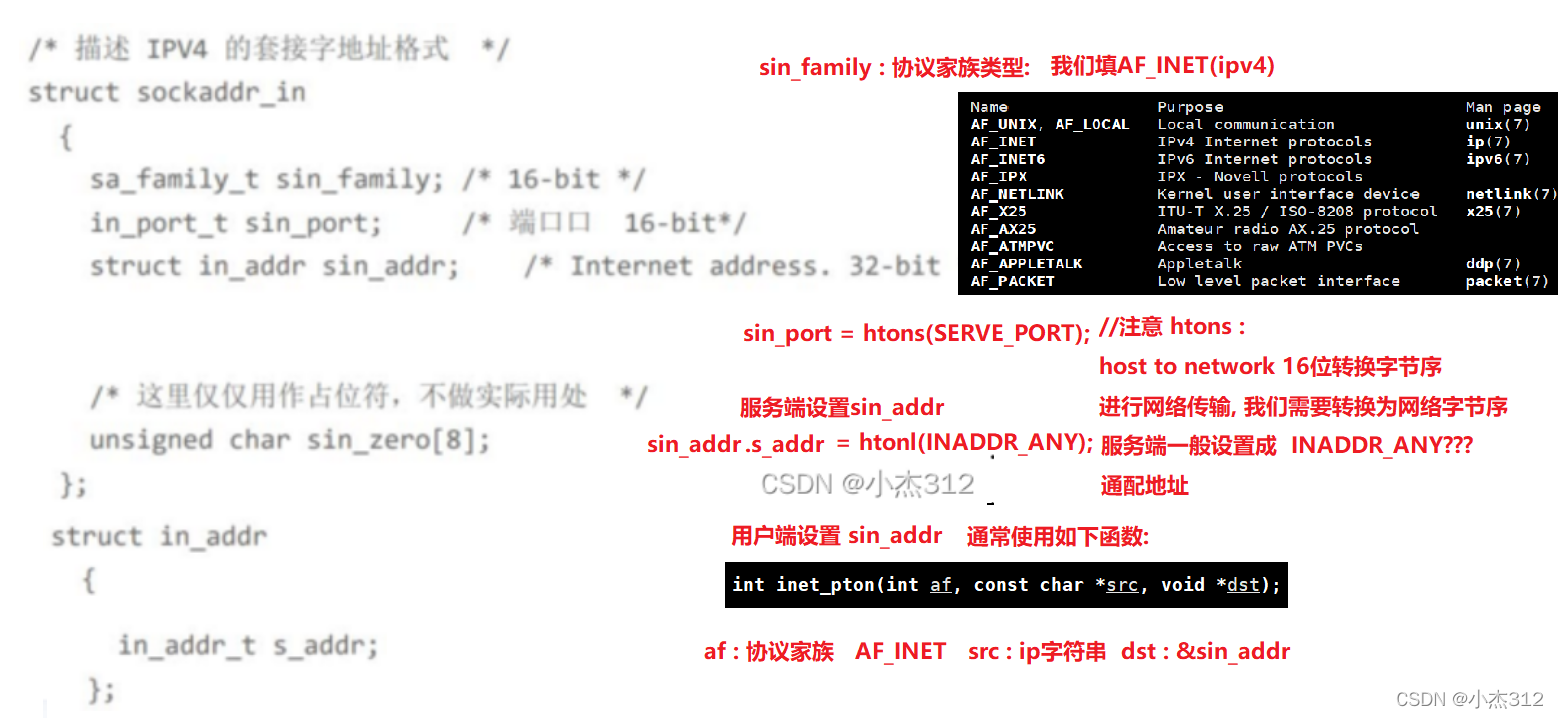 - sin_family : 协议家族 (域) 直接写 AF_INET 表示 IPV4网络协议