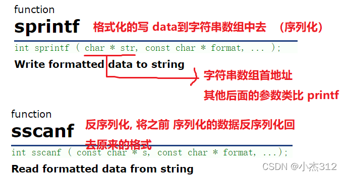 //案例1 int main() { int a = 10; char s[5] = "abc"; char buff[20] = { 0 }; sprintf(buff, "%d %s", a, s); //序列化 a = 100; s[0] = 'c'; sscanf(buff, "%d %s", &a, s); //反序列化还原 cout << a << " " << s << endl; while (1); return 0; } //案例2: /* int main () { char sentence []="Rudolph is 12 years old"; char str [20]; int i; sscanf (sentence,"%s %*s %d",str,&i); printf ("%s -> %d\n",str,i); return 0; } */