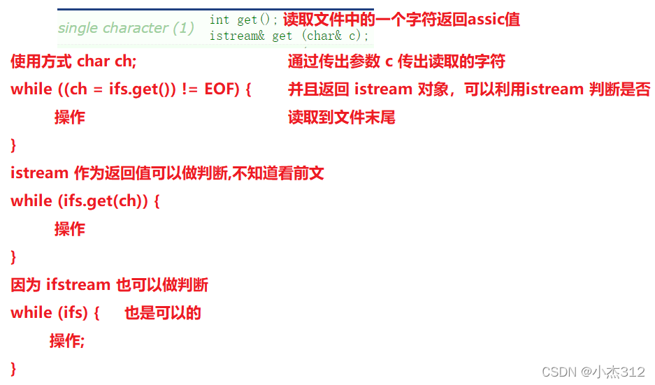 int main() { { ifstream ifs("test.txt"); //mode默认 ios::in if (!ifs) { cerr << "destruct ifs error" << endl; exit(EXIT_FAILURE); } char ch; /*方式1: while ((ch = ifs.get()) != EOF) { cout << ch; } */ /*方式2: while (ifs.get(ch)) { cout << ch; } */ //方式3: while (ifs) { cout << (char)ifs.get(); } } ifs.close(); //也可以不写, 析构中会清理 return 0; }