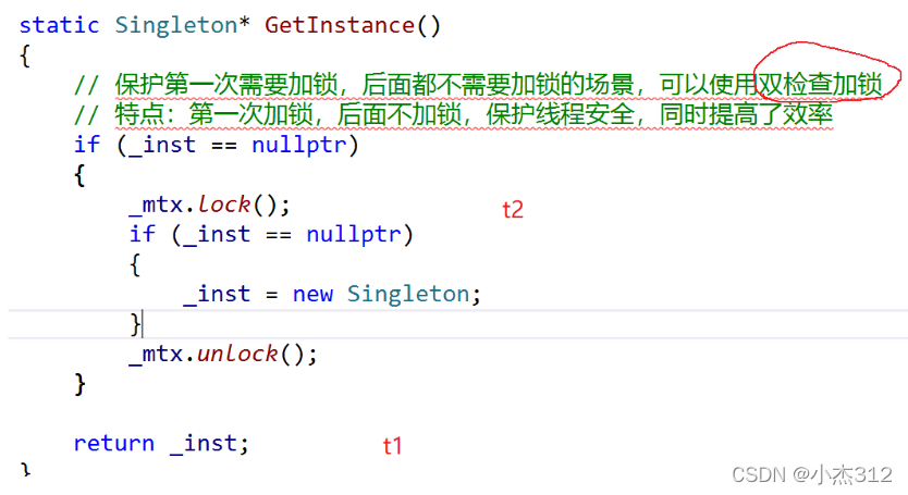但但是上述是否存在一定的效率问题?????? 要是 存在很多的线程都需要调用这个 GetInstance函数, 但是其实仅仅只是第一次写入的时候才会存在线程安全问题.,......因为一旦第一次写的时候是线程安全的, 写入进去之后其实只需要做的事情就是 读取操作了, 就不再需要写了, 这个时候, 只要经历第一次写的时候是线程安全的, 后面全部都是读取操作了, 其实就没必要再不停的加锁解锁了.... 所以这个时候我们一般会用双检查来提高效率
