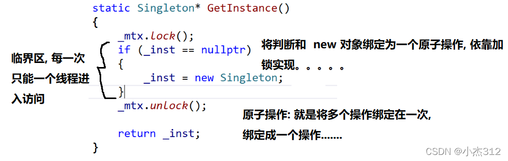 当然一个线程区调用这个GetInstance 函数是没有问题的, 但是如果是多个线程同时调用,可能就会出现冲突了.... 重入, 两个线程或者多个线程同时进入判断 _ins == nullptr 都去创建对象, 就不安全了..... 所以这个时候 针对 _ins的判断和创建操作我们需要将其绑定为一个原子操作