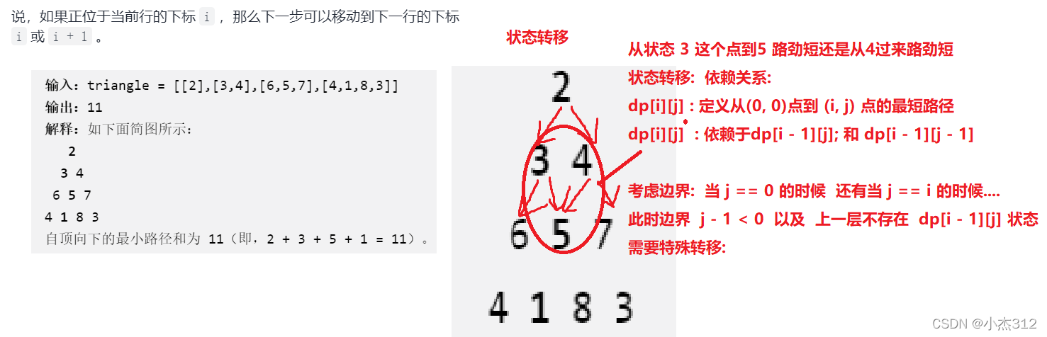 每一步只能移动到下一行中相邻的结点上。相邻的结点 在这里指的是 下标 与 上一层结点下标 相同或者等于 上一层结点下标 + 1 的两个结点。也就是说,如果正位于当前行的下标 i ,那么下一步可以移动到下一行的下标 i 或 i + 1 。