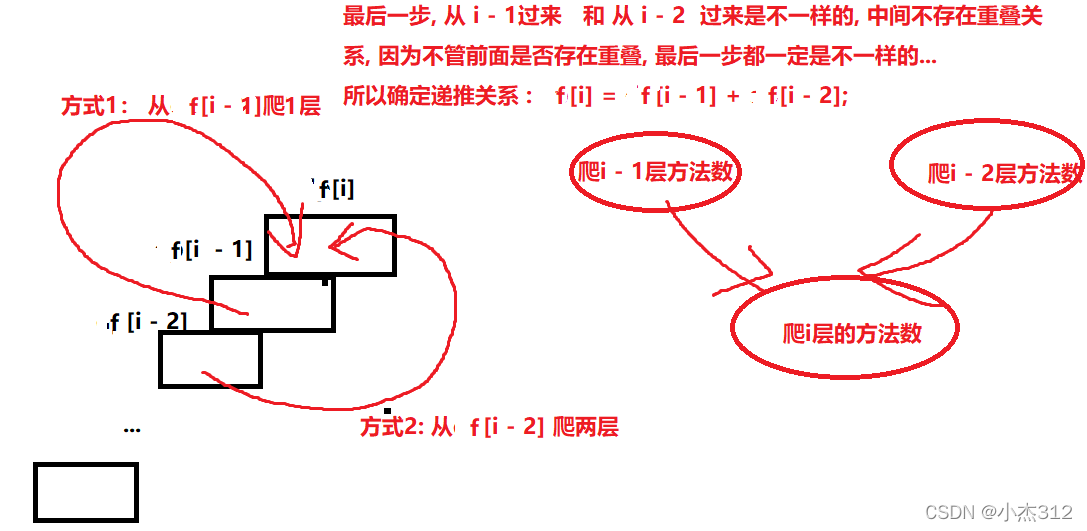 - 状态转移方程: 分析依赖关系 ?? 每一次可以爬上1 或者 2 个台阶, 所以 当你站上 i 阶级台阶的时候, 你的上一个状态 可以是站在 i - 1 阶台阶上, 或者是 i - 2 阶级台阶上的. 图解转移:
