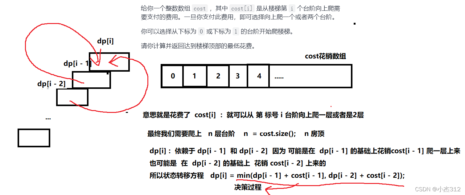 initial : dp[0] = 0; dp[1] = 0; 起始楼梯, 没有花销: