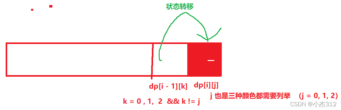 状态转移: 核心关键, 最后 的 i 染的颜色 i - 1 不可以染, 所以 dp[i][j] 依赖的是前面的dp[i - 1][k] ( k != j)
