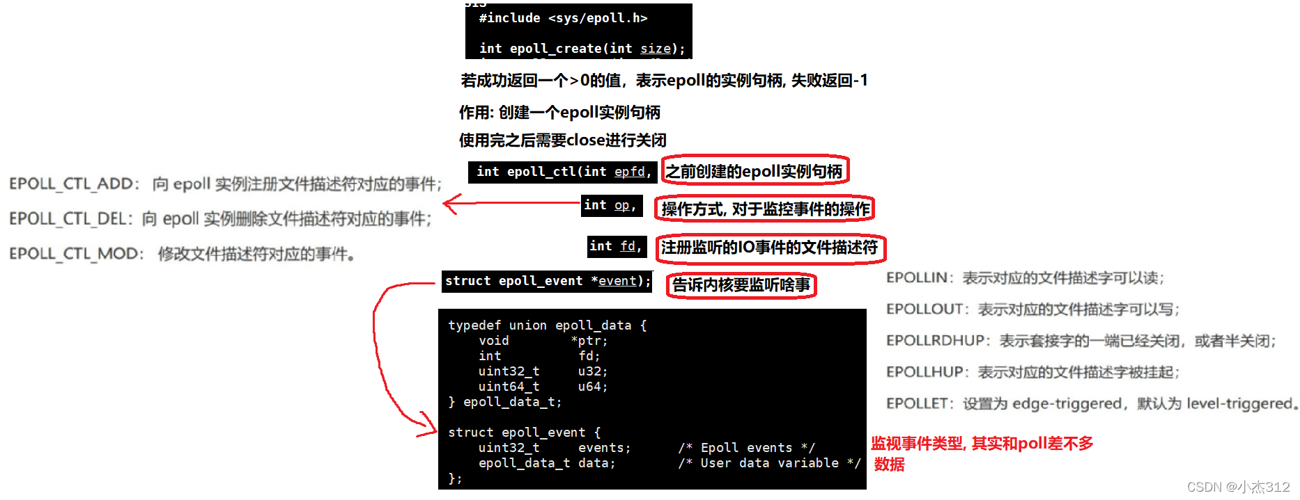epoll_ctl先提前注册号需要监视的事件,然后调用epoll_wait阻塞获取IO触发的事件, 在使用epoll_wait的时候不需要像使用select + poll那样需要每次都重新拷贝需要监视的IO事件到内核中进行检测,而是进行了分离, 提前用epoll_ctl注册好需要监视的事件,然后epoll_wait获取触发的IO事件