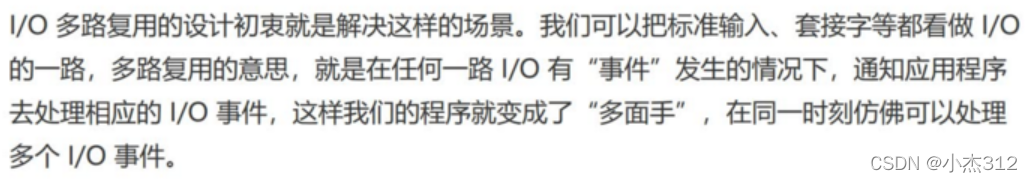 eg : 我们可以同时监视标准输入和socket IO事件地发生, 正常来说一旦直接进行accept挂起等待socket IO事件,就无法接收其他地IO事件了, 但是IO多路复用可以使得一个进程既可以监视socket IO 也可监视 标准输入了