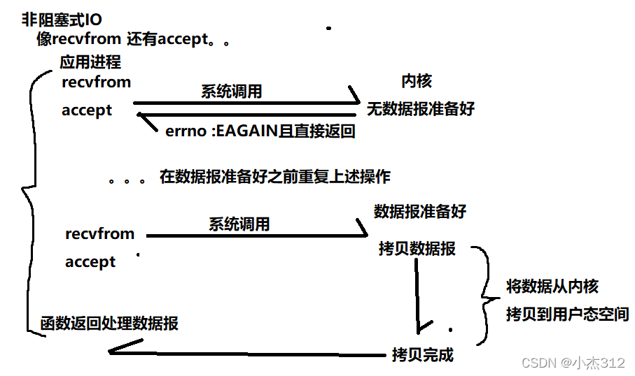 非阻塞IO请求,不会阻塞等待IO,而是直接返回采取定期轮询地方式来不停调用非阻塞函数, 直到数据报准备好拷贝回到用户空间进行处理,在没有准备好之前地调用返回地同时会设置errno = EAGAIN或说EWOULDBLOCK