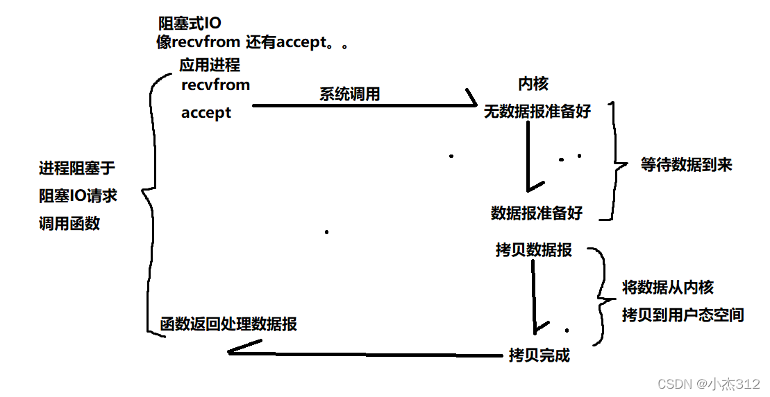阻塞式IO请求调用函数,如果IO没有到位会一直阻塞应用程序等待IO数据报满足再拷贝回到用户空间进行处理