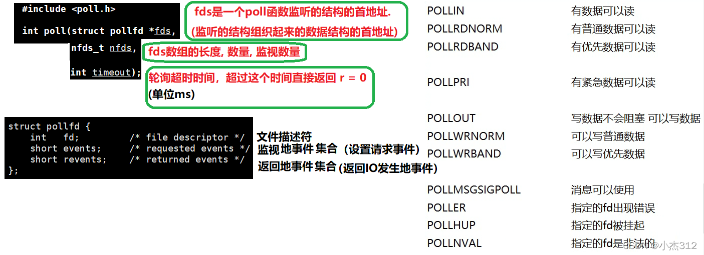 pollfd结构包含了要监视的event和发生的event,不再使用select“参数-值”传递的方式. 接口使用比 select更方便.