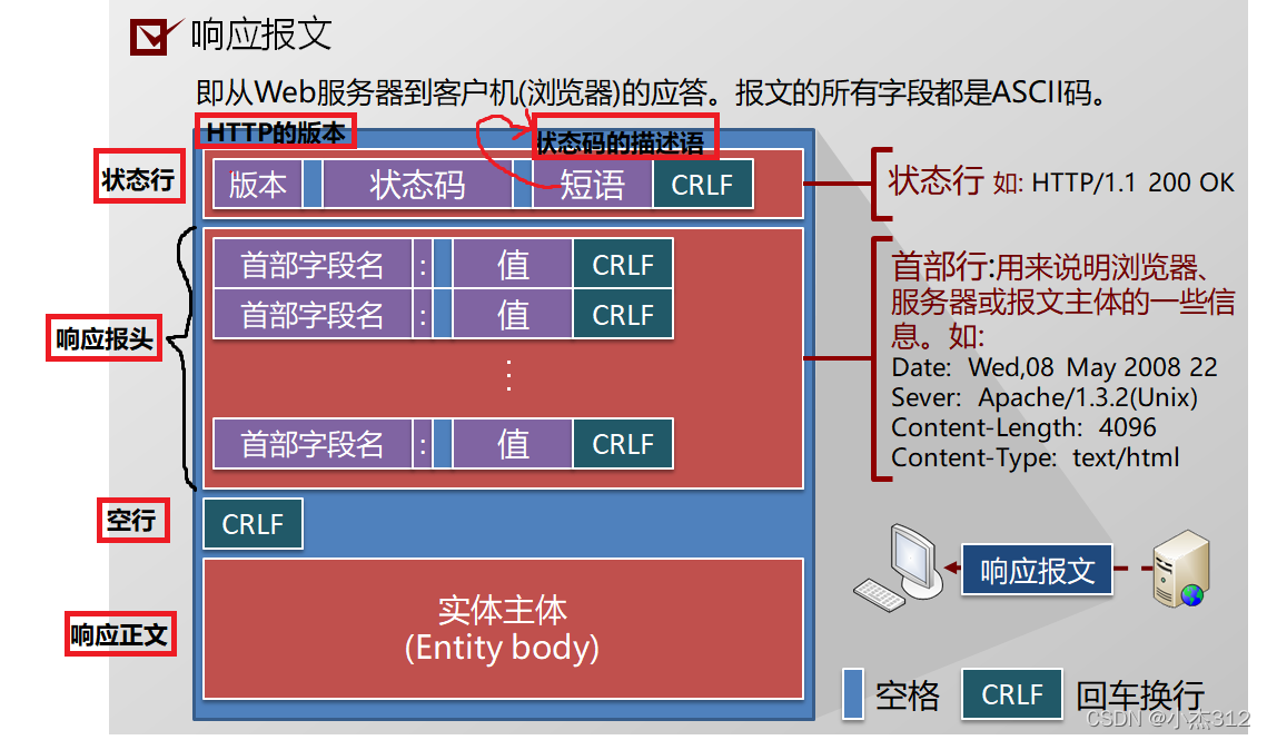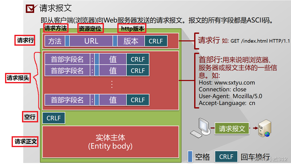 上述的核心在于最开始的一行请求行 (请求方法 URL 协议版本) + 状态行(协议版本 状态码 状态码描述字段) 搞清楚空行的作用:分割报头和正文