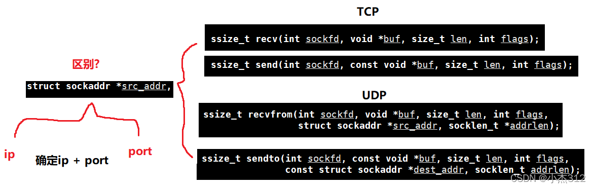 首先不论是有连接还是无连接, 我们核心应该确定的是什么? 确定四元组,对了四元组,无连接也可以进程间通信,只不过每一次必须传入四元组, 但是口说无凭, 咱看看接口呗。对比一下: