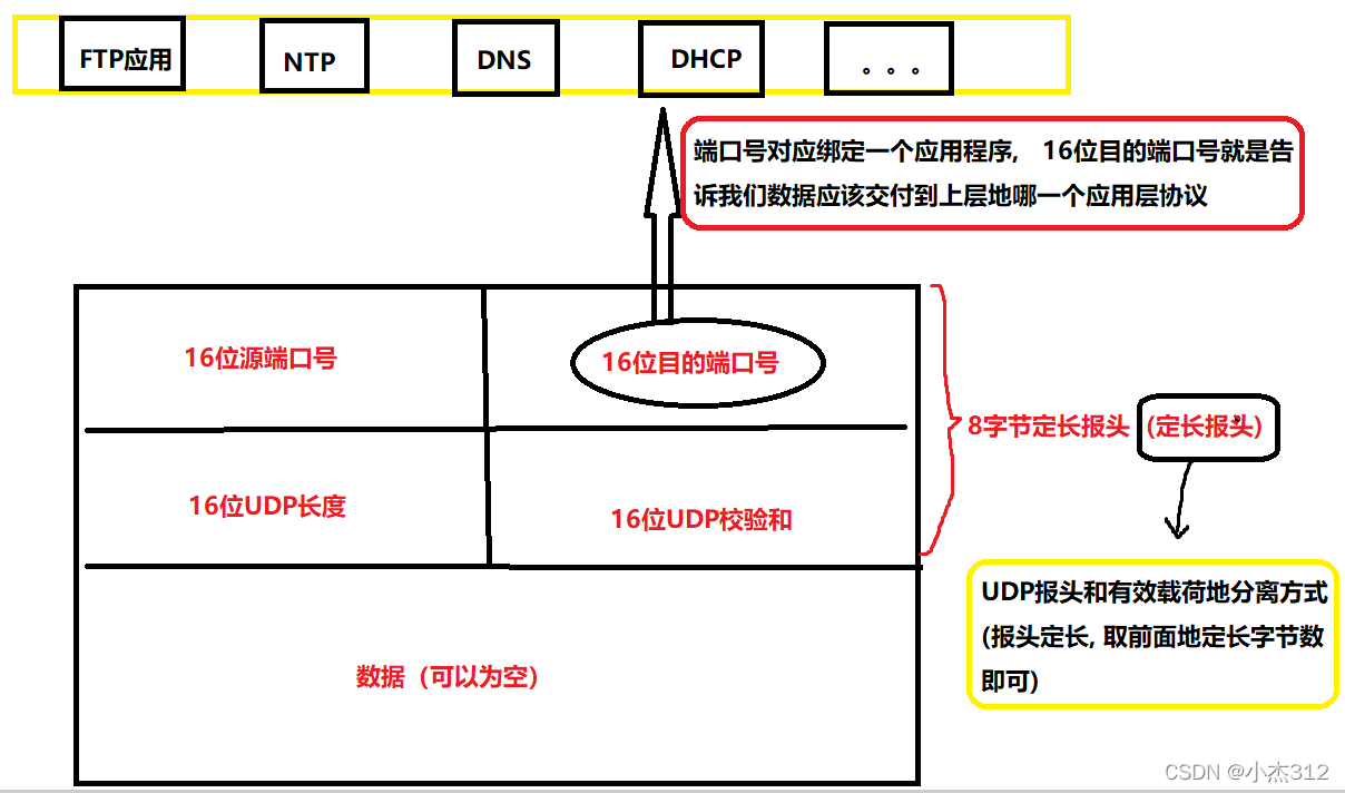 目的端口号:服务器端口号, 负责确定交付给哪个应用程序.