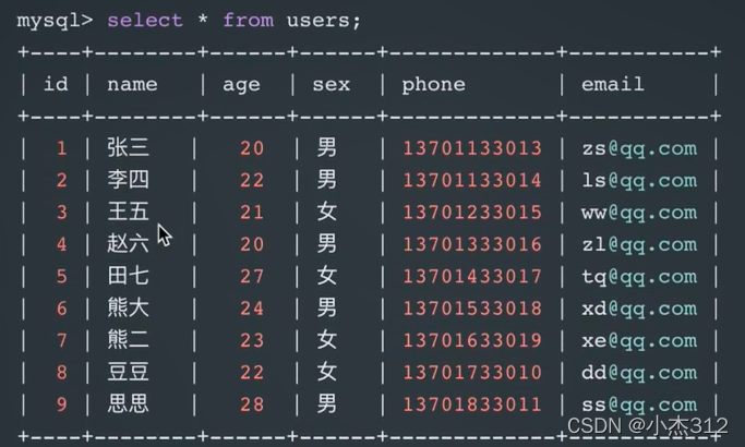 select * from 表 查看查询表数据 * 代表查询所有 可以指定字段 (指定列)