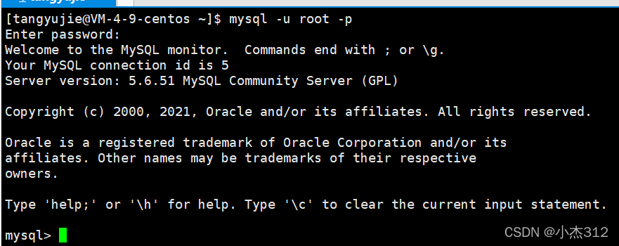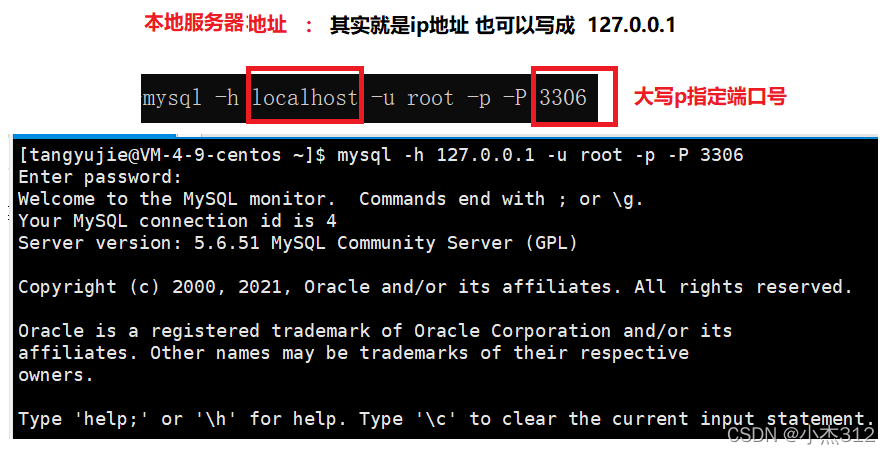 mysql -h localhost -u root -p -P 3306 //(按回车) Enter password: // -h 服务器地址 // -u 登录地账户名 // -p 账户密码 // -P(大写) 端口号,mysql默认是3306