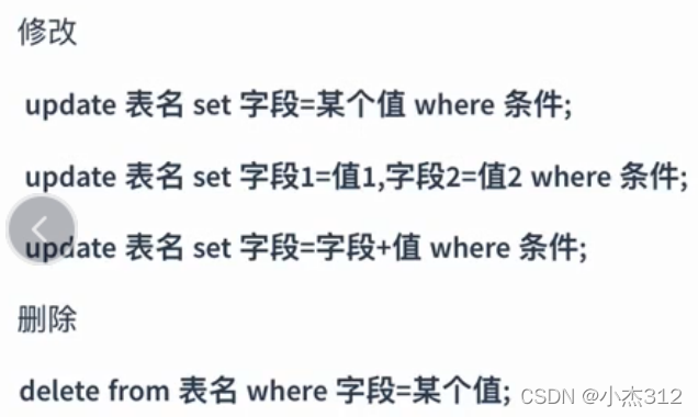 insert into 表名(字段1, 字段2, 字段3...) values(值1, 值2, 值3...); //插入一行数据 insert into 表名(字段1, 字段2, 字段3...) values(值1, 值2, 值3...), values(值1, 值2, 值3...); //插入多行数据