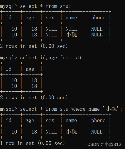 select * from 表名; //查看整个表 select 字段1, 字段2, 字段3, from 表名; //查看含有指定字段的列 select * from 表名 where 字段=某个值; //指定查询字段=特殊值的一行