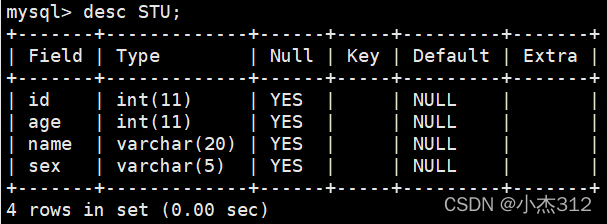 Filed: 字段名 Type 字段类型 NULL 可否为空 Default 默认值