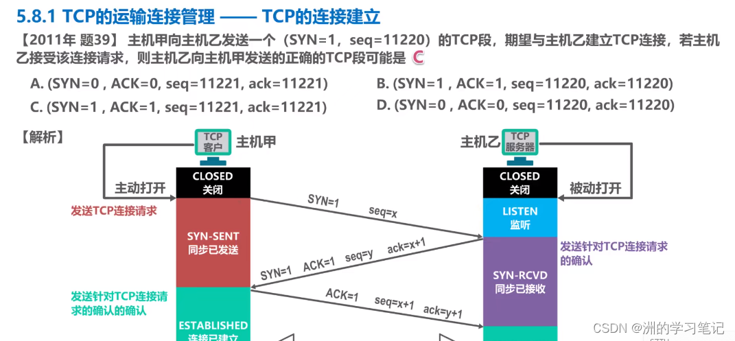 SYN=1,表明这是一个TCP连接请求报文段。序号字段seq被设置了一个初始值x,作为TCP客户进程所选择的初始序号。