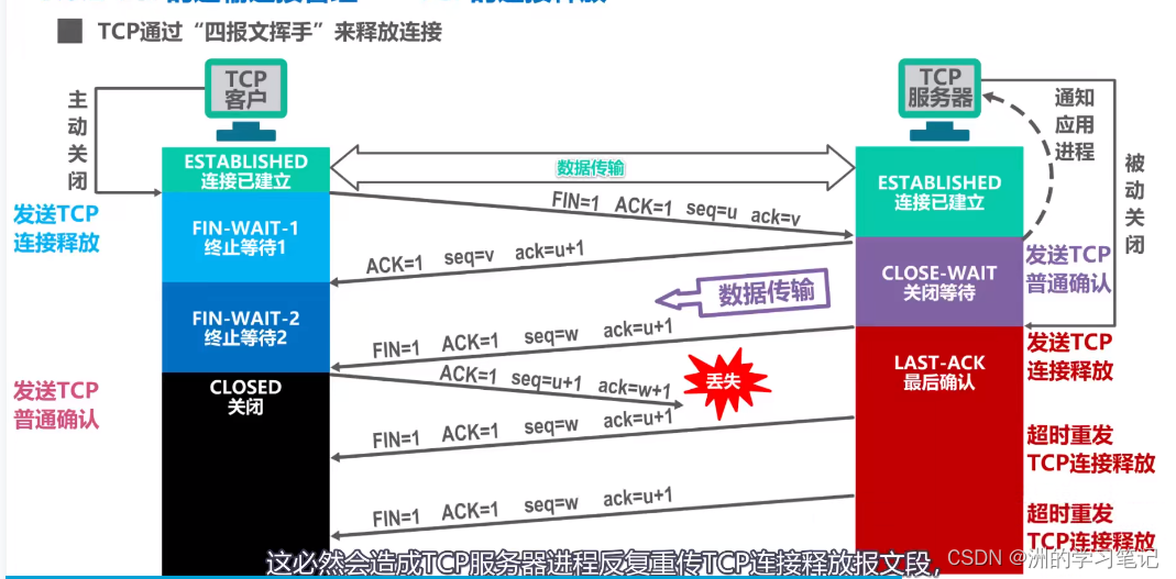 同时也对之前收到的报文段进行确认:序号seq=u,它等于客户进程发送的最后一个数据的最后字节序号+1,。