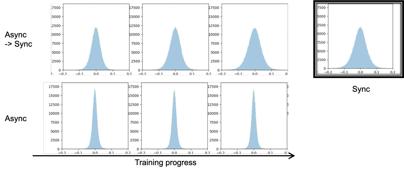 进一步的观察说明,异步和同步训练本质上会导致模型向不同的收敛方向更新,如图2所示,异步和同步训练后某层参数的分布截然不同,而异步切换为同步训练一段时间后,参数分布是被强行训练更新到了类似同步的分布上。这意味着为了获得平滑的切换,保证参数分布不变是一个值得考虑的出发点。
