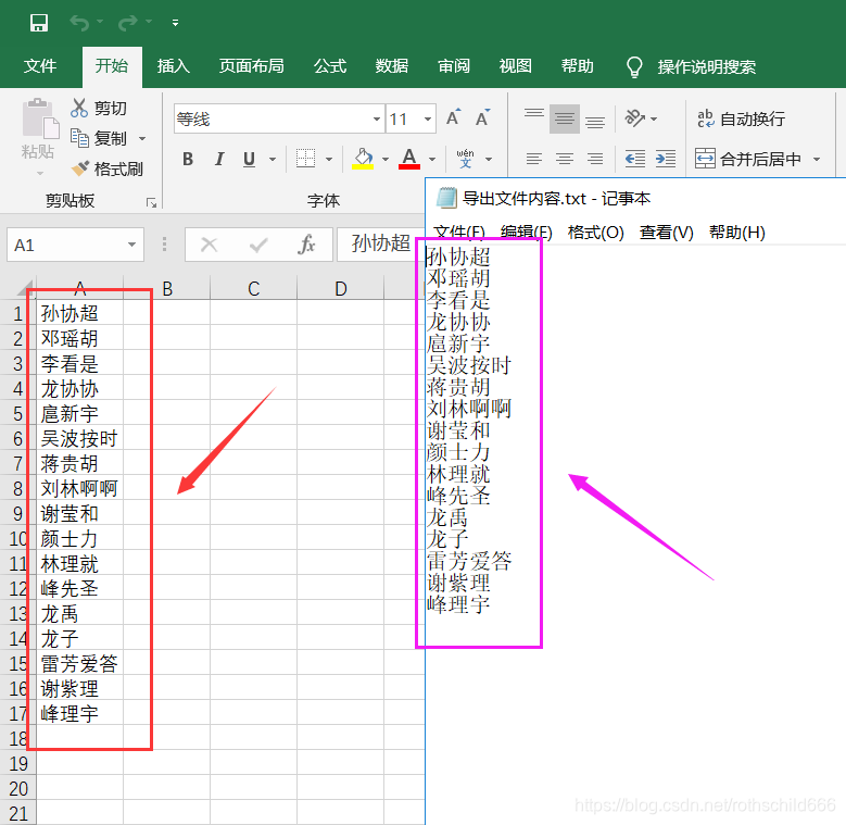 十、双击打开保存的txt文件,就会发现已经实现将excel文件中的内容转换成word文本(去表格)。内容完全一致(可见下图红框和紫框对比内容完全一致)