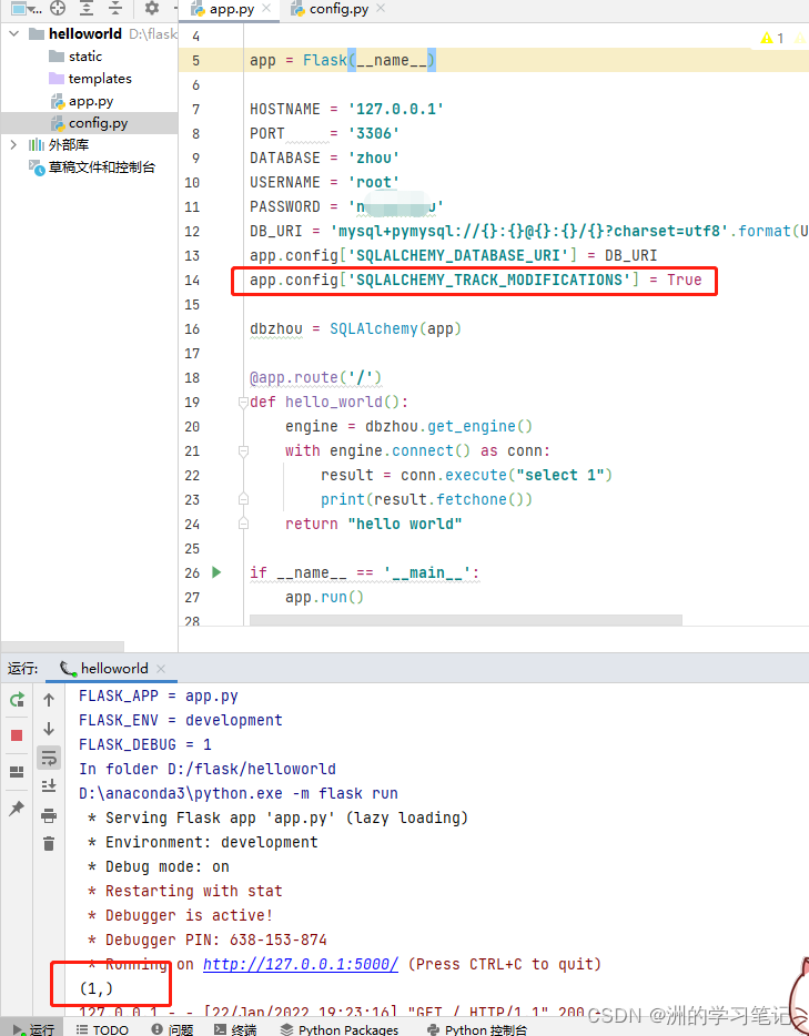 from sqlalchemy import create_engine # 数据库的配置变量 HOSTNAME = '127.0.0.1' PORT = '3306' DATABASE = 'zhou' USERNAME = 'root' PASSWORD = 'nidemima' DB_URI = 'mysql+pymysql://{}:{}@{}:{}/{}?charset=utf8'.format(USERNAME,PASSWORD,HOSTNAME,PORT,DATABASE) # 创建数据库引擎 engine = create_engine(DB_URI) #创建连接 with engine.connect() as con: rs = con.execute('SELECT 1') print rs.fetchone()