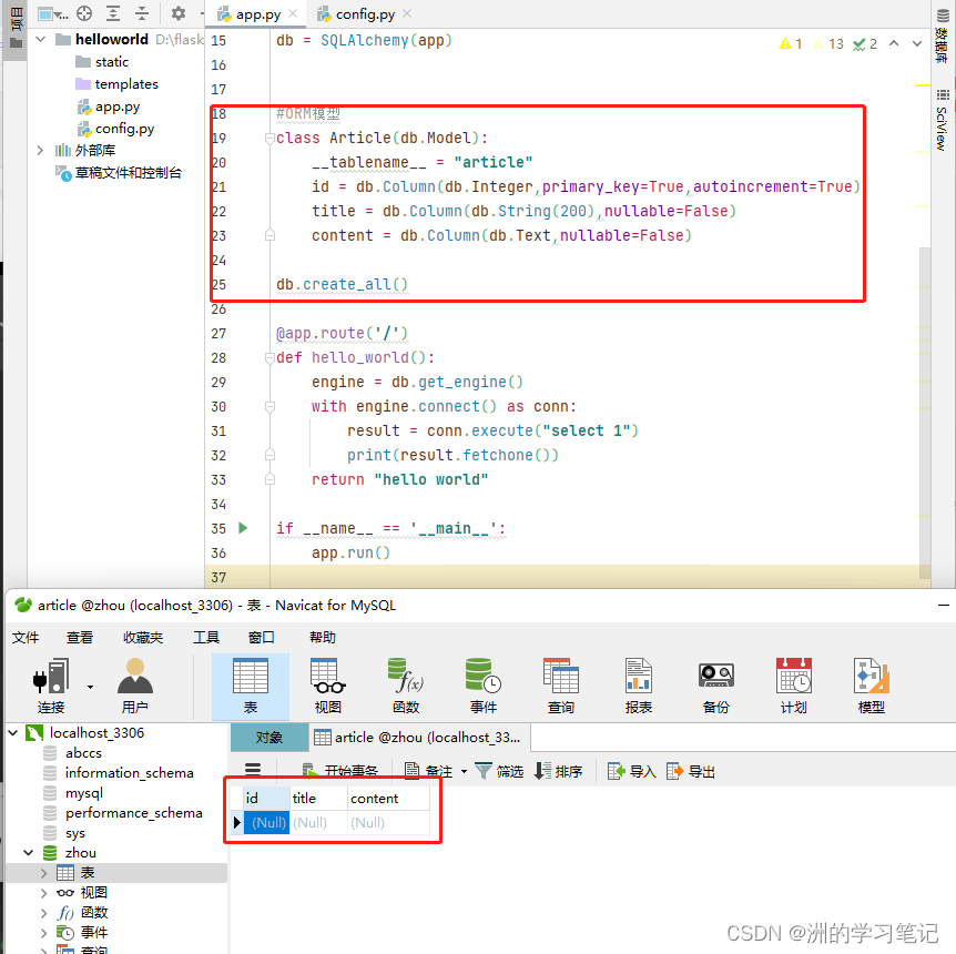 #ORM模型 class Article(db.Model): __tablename__ = "article" id = db.Column(db.Integer,primary_key=True,autoincrement=True) title = db.Column(db.String(200),nullable=False) content = db.Column(db.Text,nullable=False) db.create_all()