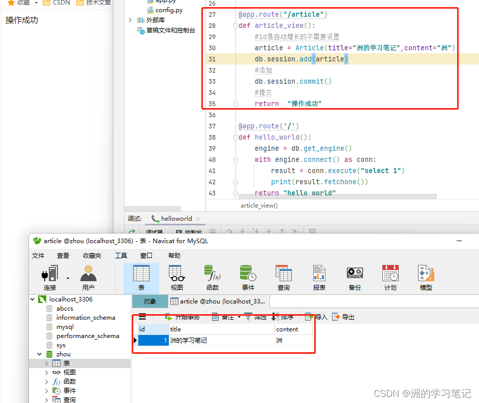 @app.route("/article") def article_view(): #id是自动增长的不需要设置 先建立一个对象 然后进行增加 article = Article(title="洲的学习笔记",content="洲") db.session.add(article) #添加 db.session.commit() #提交 return "操作成功"