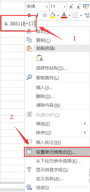 第一步、选择相应的需要转换的单元格,然后右击一下,再选择并左击红色箭头2指向的红色框中的内容(设置单元格格式)。