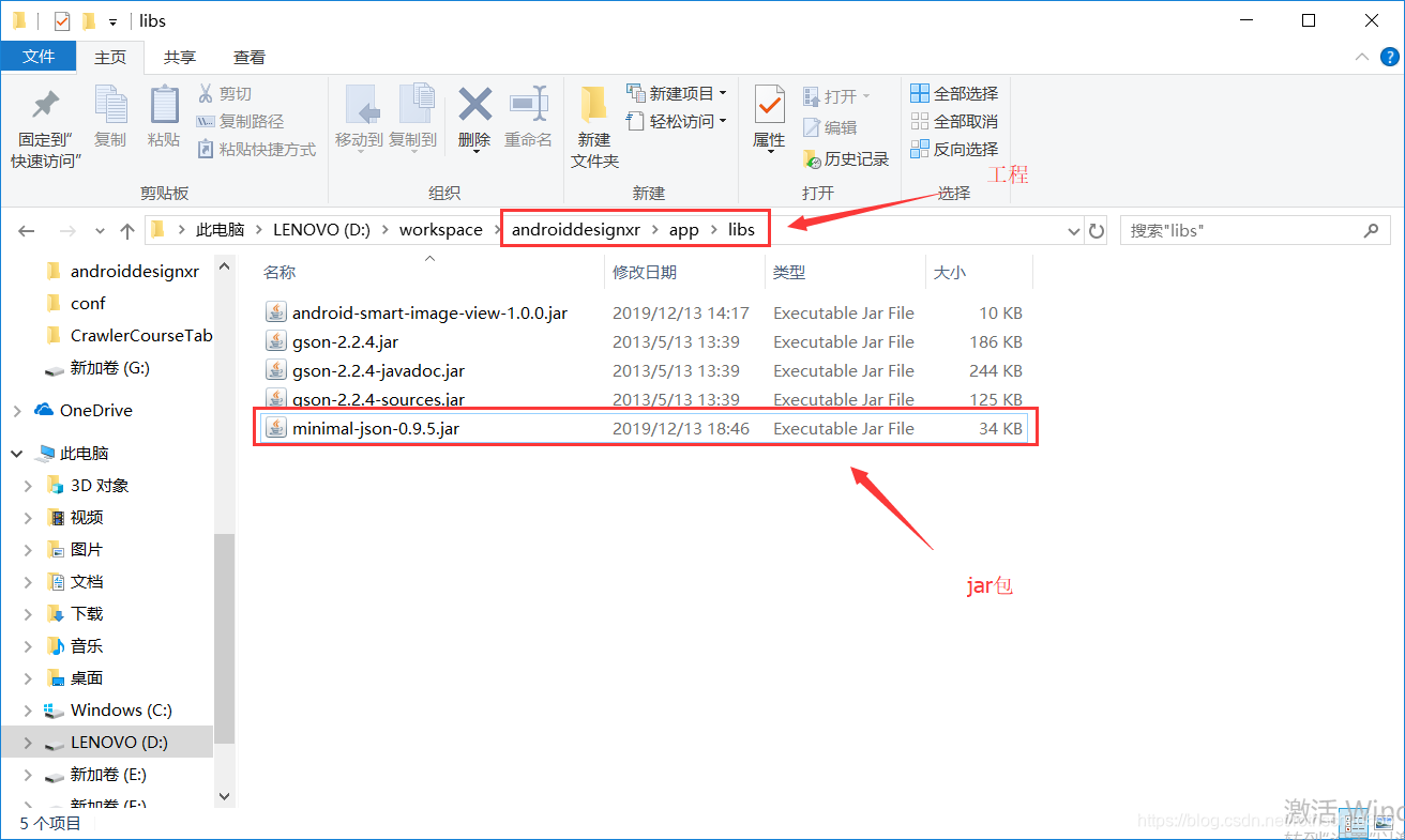 二、下载完之后,然后将minimal-json-0.9.5 jar包复制到你出现Cannot resolve symbol 'json’问题的工程(博主举的例子是androiddesignxr工程)中的app中的libs里面。