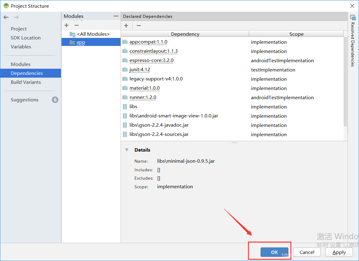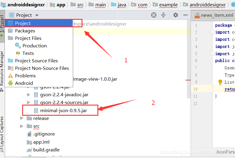 三、首先选择Project界面,然后可以看到app中的libs中显示还未导入的包minimal-json-0.9.5 jar包。