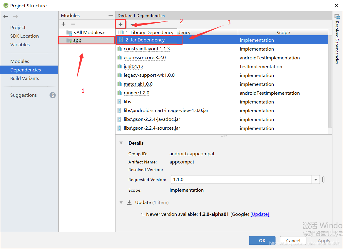 五、点击“app”,再点击“+”,最后点击“jar Dependence”。