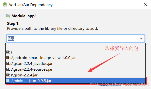 六、点击下拉框选择要导入的包,这里我们选择的是“minimal-json-0.9.5 jar”包。