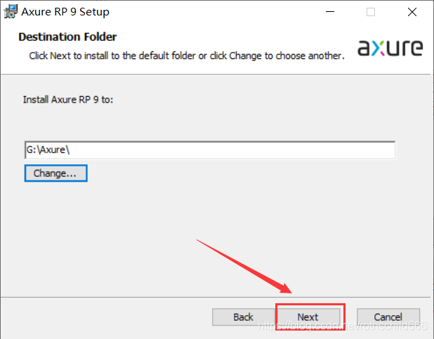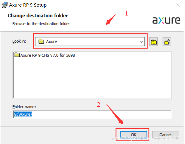 六、点击红色箭头1指向的红色框中的下拉框选择安装路径(博主安装到G盘的Axure文件夹中),然后点击“OK”。