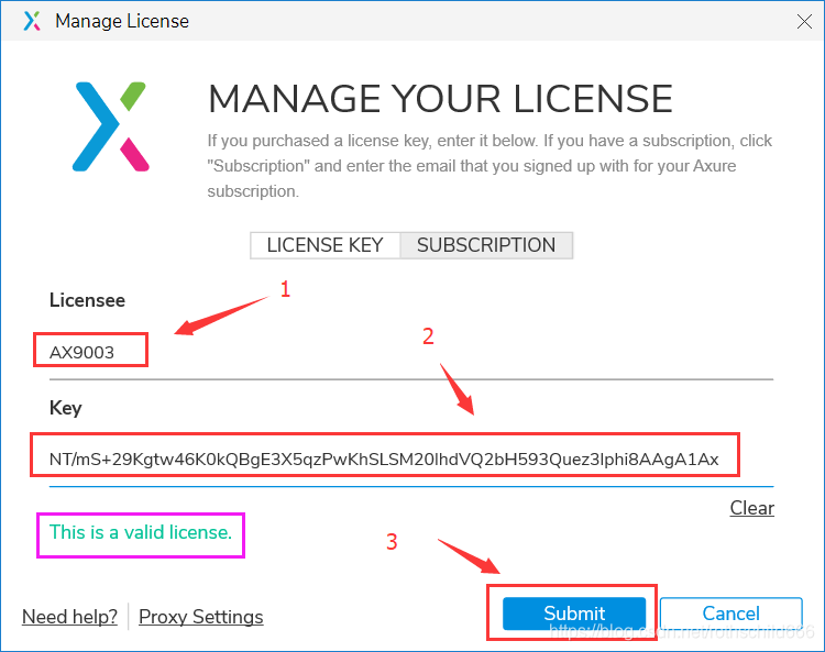 十三、两种授权码大家自由选择,然后复制粘贴到下面图片的红色箭头1和红色箭头2指向的内容,若出现紫色框中的内容说明成功匹配(若没出现说明上面的授权码失效了,那么点击链接:点击打开axure rp9授权码最新链接 进行最新授权码的搜索,重新进行匹配),然后点击“Submit”。