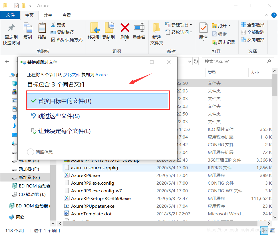 十七、将上面复制的四个文件粘贴到之前安装Axure pr的目录中去(博主是安装到G盘Axure文件夹中),然后弹出弹框时点击“替换目标中的文件(R)”。
