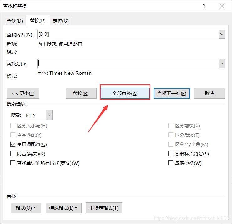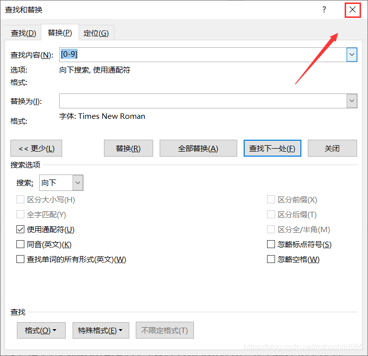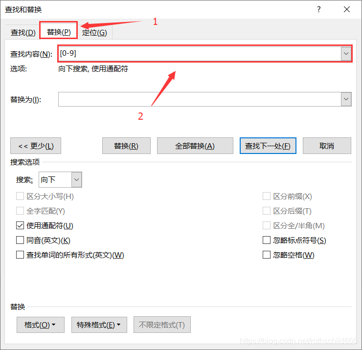 六、点击“替换(P)”,然后在“查找内容(N)”框中输入“[0-9]”。