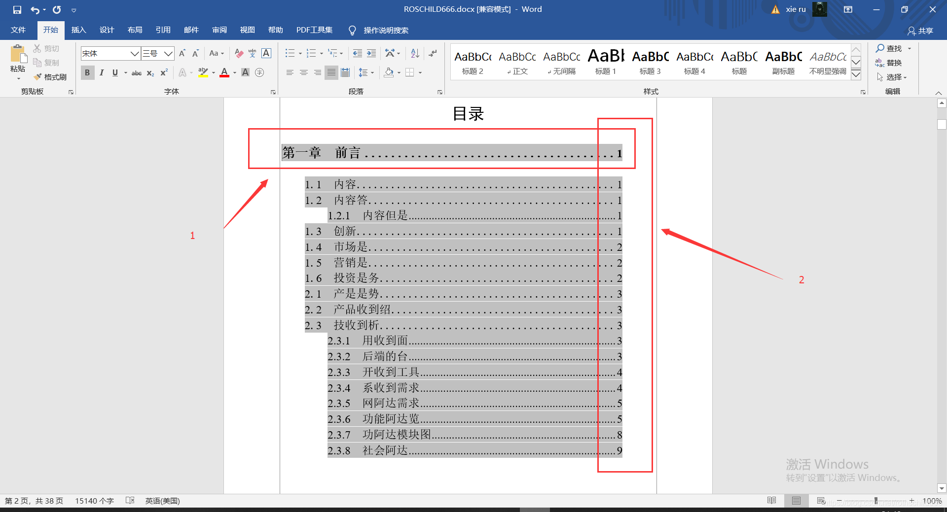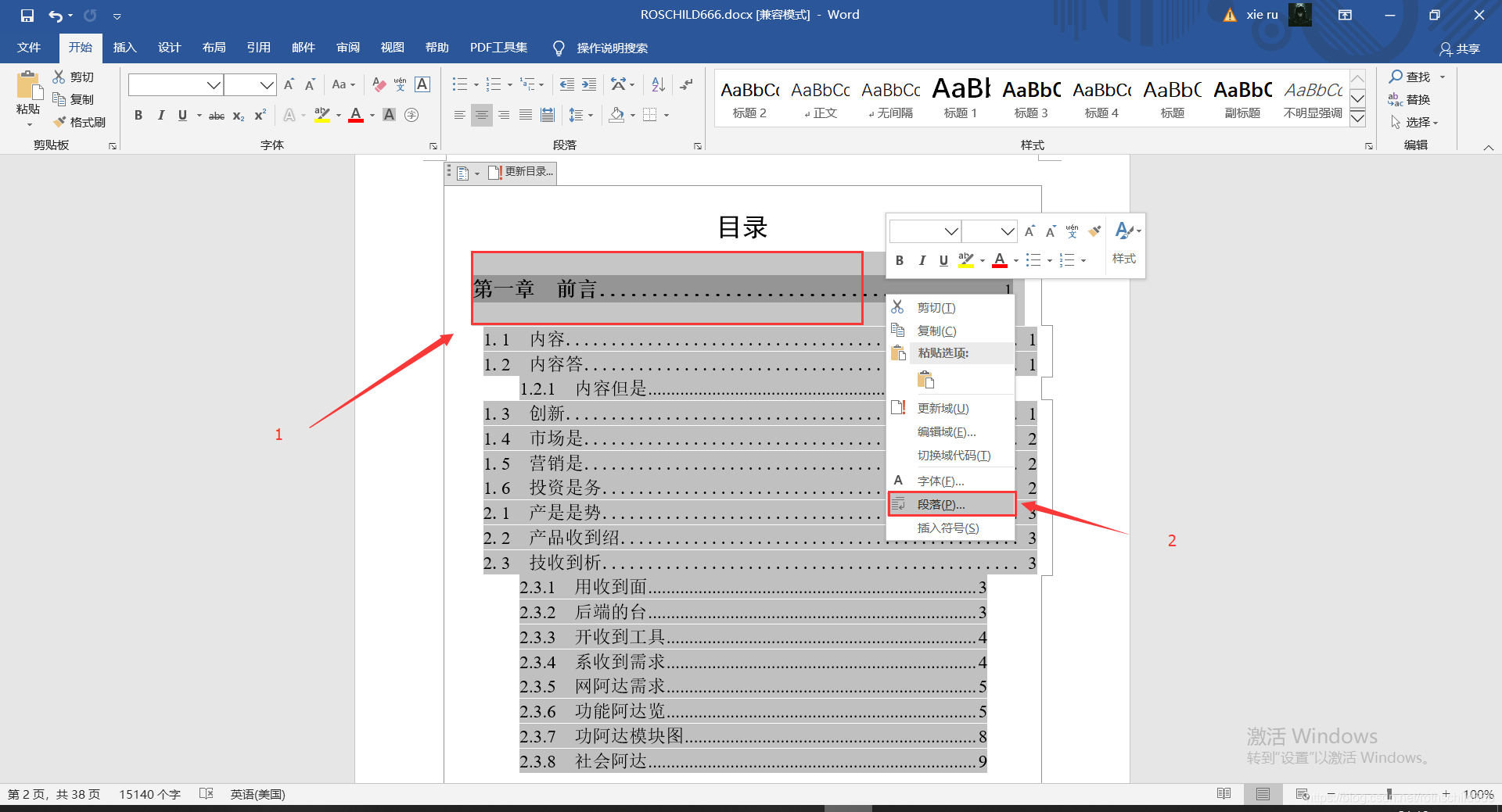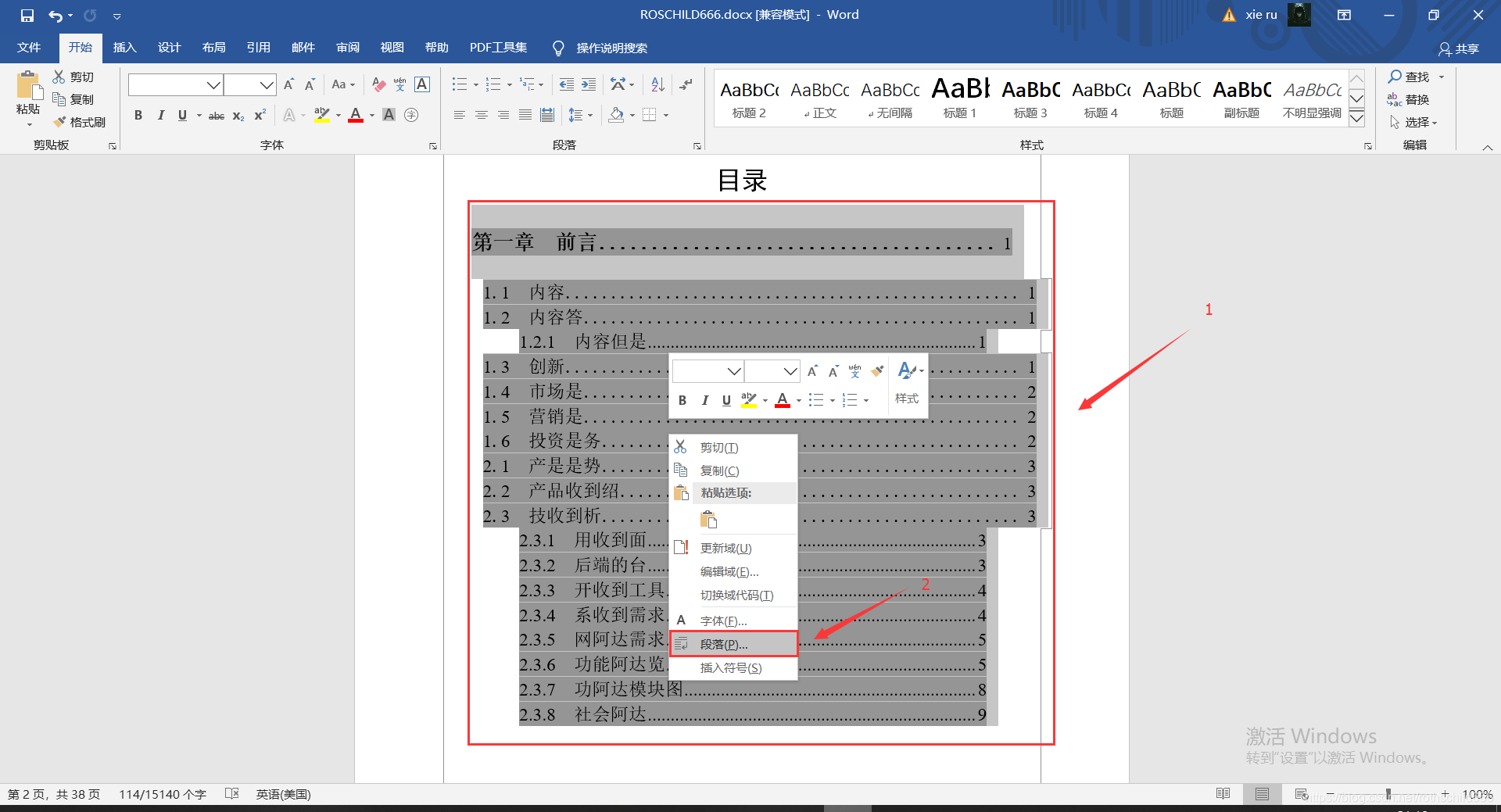 四、选择自动生成目录中需要等格的内容(见下图红色箭头1指向的红色框内容,博主是全选了目录第一章中所有内容),然后左击,再选择右击“段落(P)”(见下图红色箭头2指向的红色框内容)。