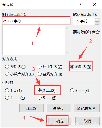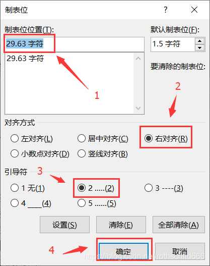 三(重点)、复制红色箭头1指向的红色框内容(博主举例的是制表符位置(T)是29.63字符),然后注意红色箭头2和红色箭头3指向的红色框内容,后续第六步要用到,记住之后点击“确定”。