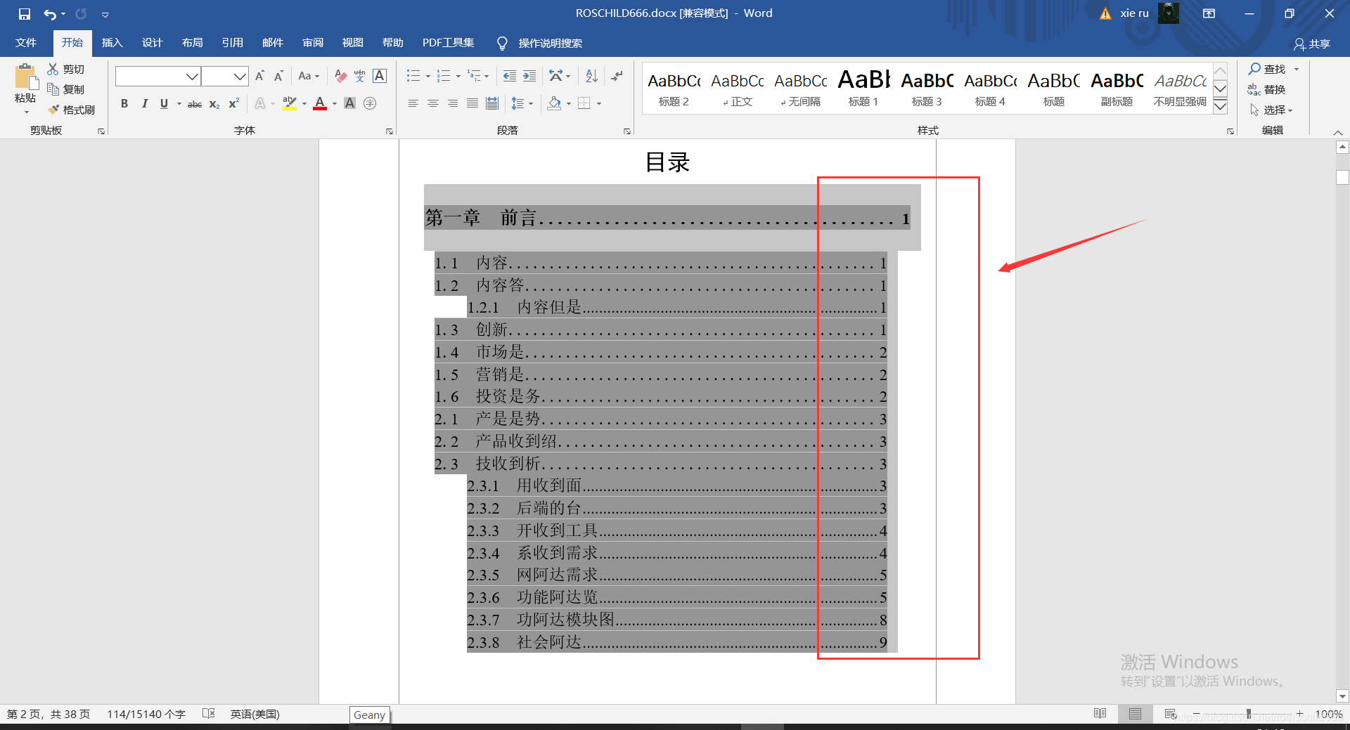 八、如果需要全部等格可以将目录中第一章该行中的前面空格删掉就能够目录右边页面全部变成等格。