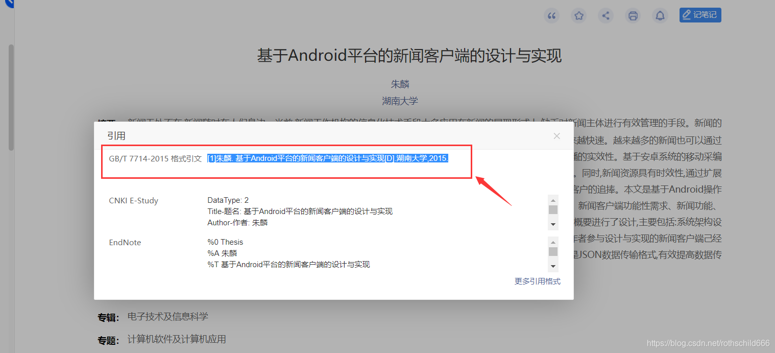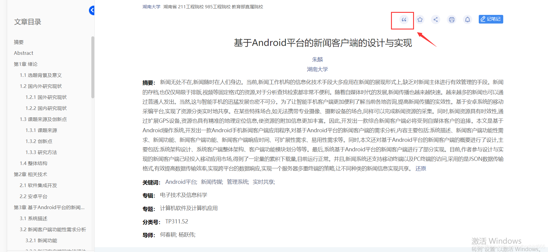 一、首先在中国知网上查找到你需要引用的论文,然后点击下图中红色的(“)。