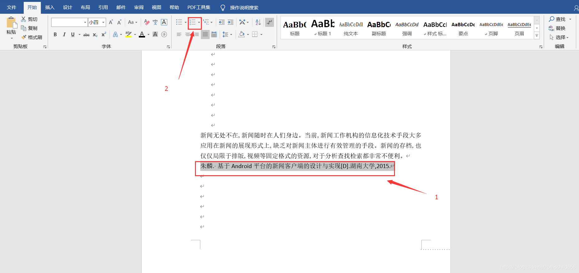 四、接下来首先选中红色箭头1指向的内容也就是你要引用的论文,然后点击红色箭头2指向的内容(编号)。