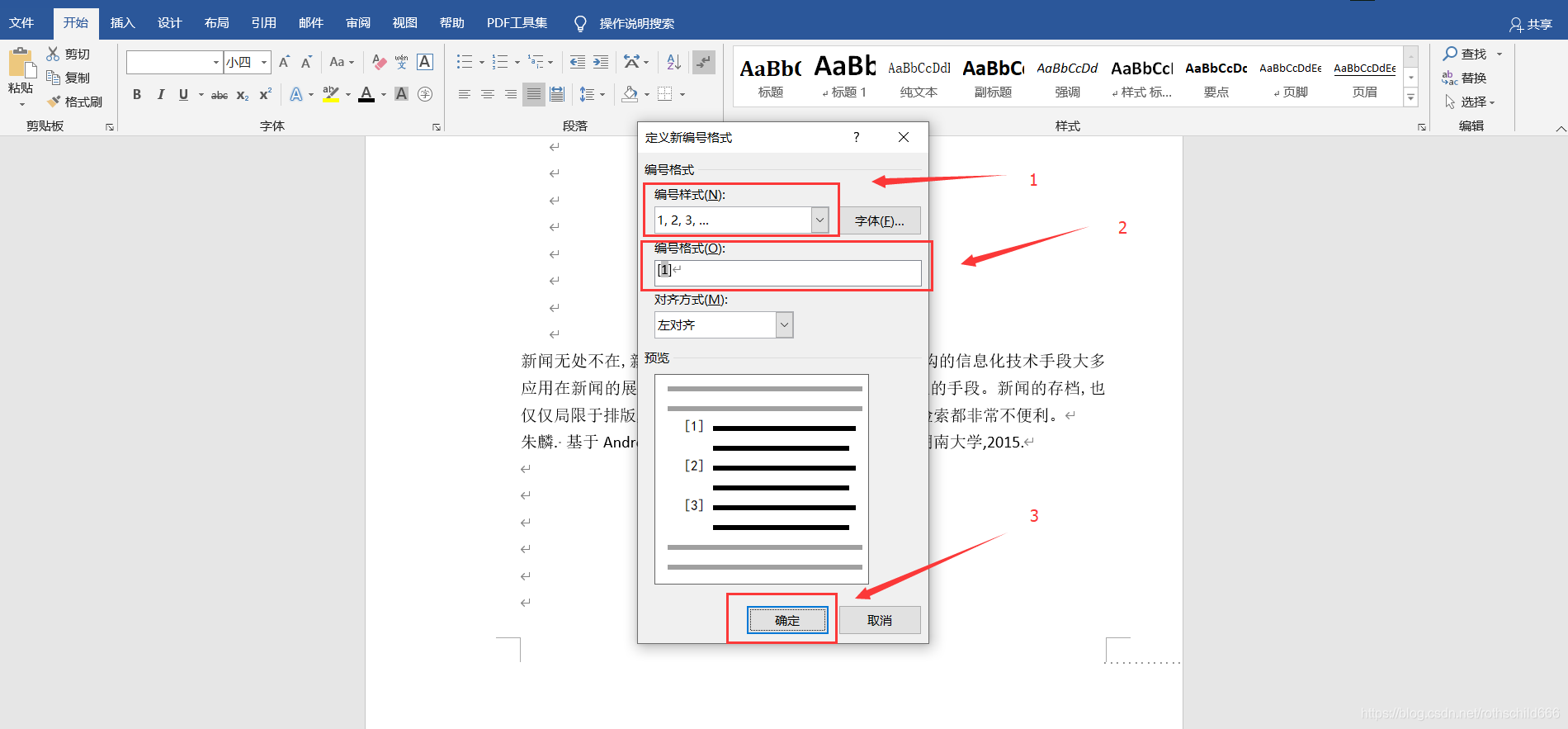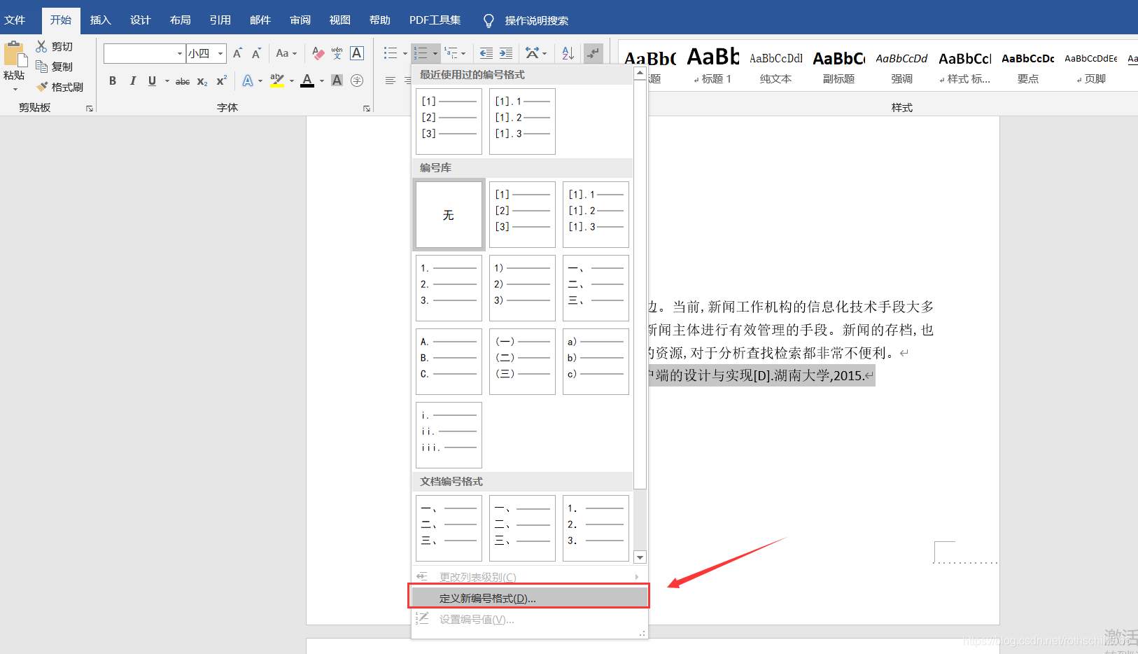 五、点击后出现一个选择页面,点击选择红色箭头指向的(定义新编号格式)。