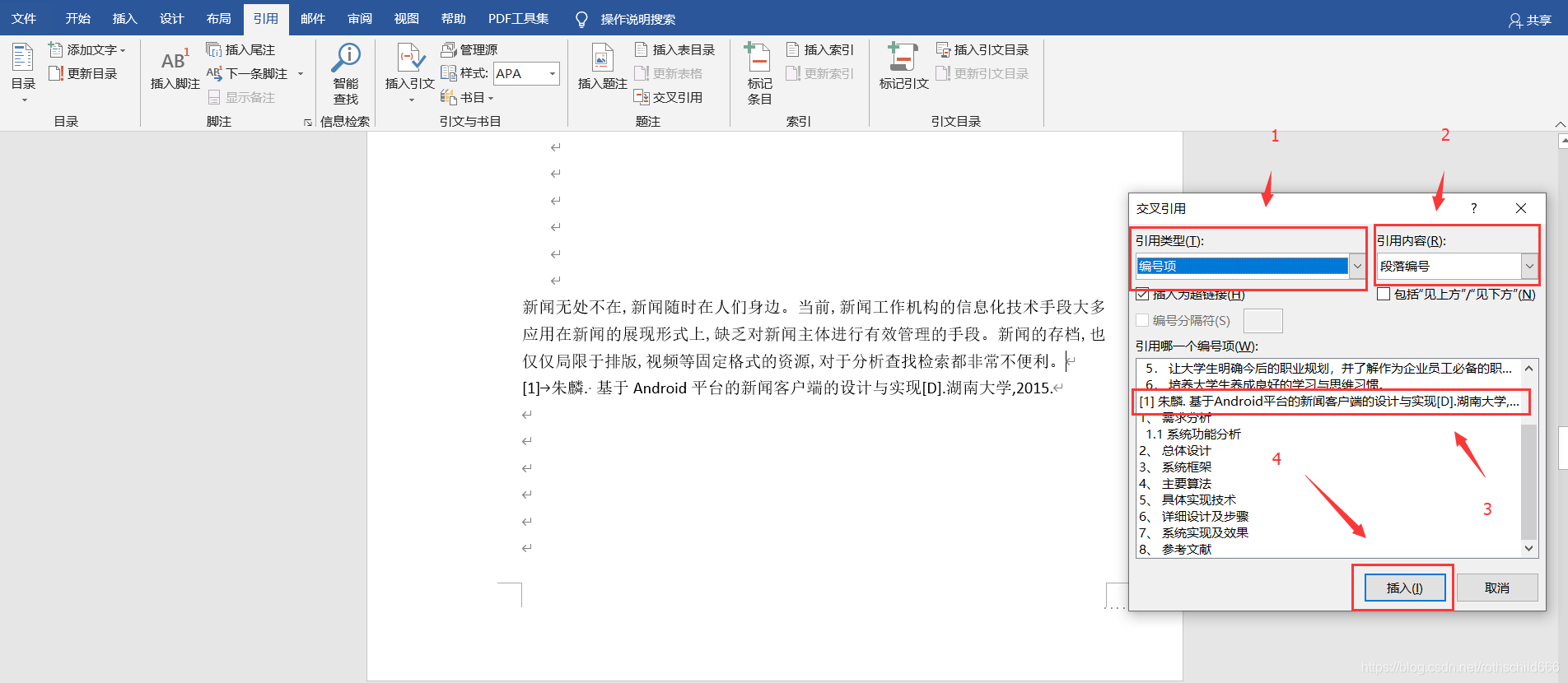 九、根据下面图片依次选择到位,第三步是选择你之前编号好的引用论文,最后第四步点击(插入)。