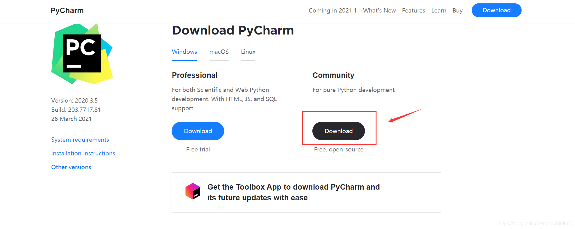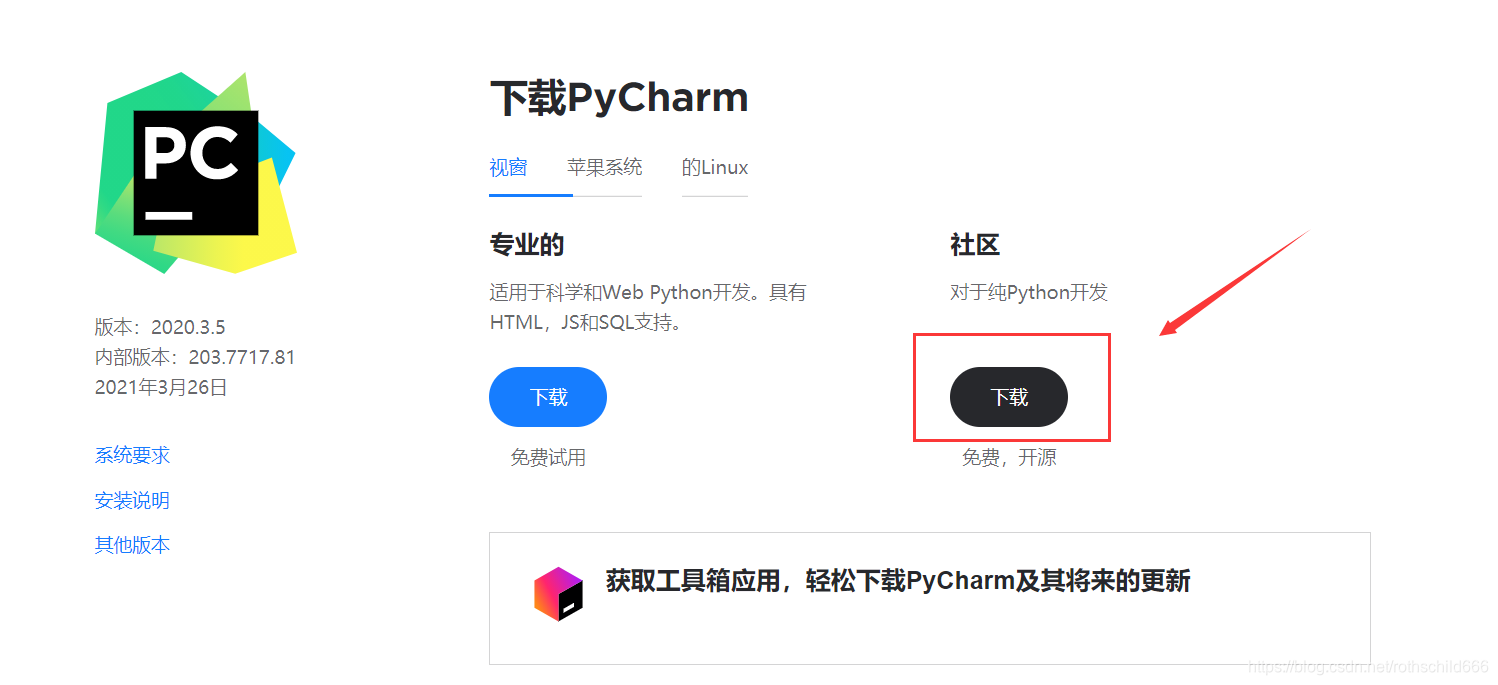 二、点击下载Community社区版pycharm(红色箭头指向的红色框内容),因为是免费开源。