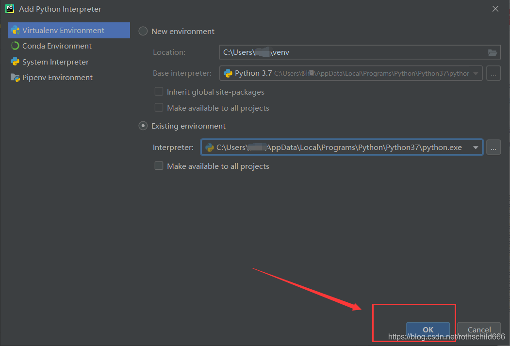 十五、首先选择”Existing environment“,然后找到python解释器安装后的路径,选择你之前已经下载好的python解释器,python解释器是以“.exe”结尾的文件,最后”ok“。